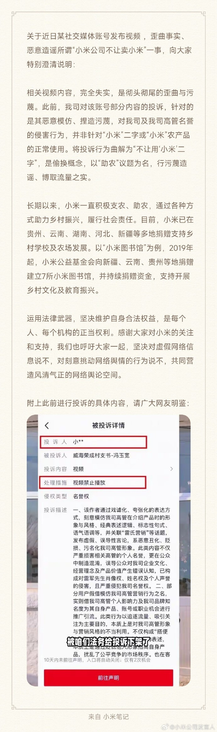 12月12日,@小米公司发言人发布澄清说明,回应所谓“小米公司不让卖小米”一事。小米方面表示,相关视频内容,完全失实,是彻头彻尾的歪曲与污蔑。此前,公司对该账号部分内容的投诉,针对的是其恶意模仿、捏造污蔑,对公司及公司高管名誉的侵害行为掌乐策略,并非针对“小米”二字或“小米”农产品的正常使用。将投诉行为曲解为“不让用‘小米’二字”,是偷换概念,以“助农”议题为名,行污蔑造谣、博取流量之实。