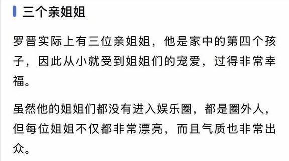 网上现在传得有鼻子有眼的,说罗晋确实有三个姐姐。还说早几年罗晋上节目的时候,自己就跟大伙儿介绍过这三个姐姐。连人家干啥工作都给扒出来了,大姐是当老板的,二姐是校长,三姐是搞设计的,说得跟真的一样!